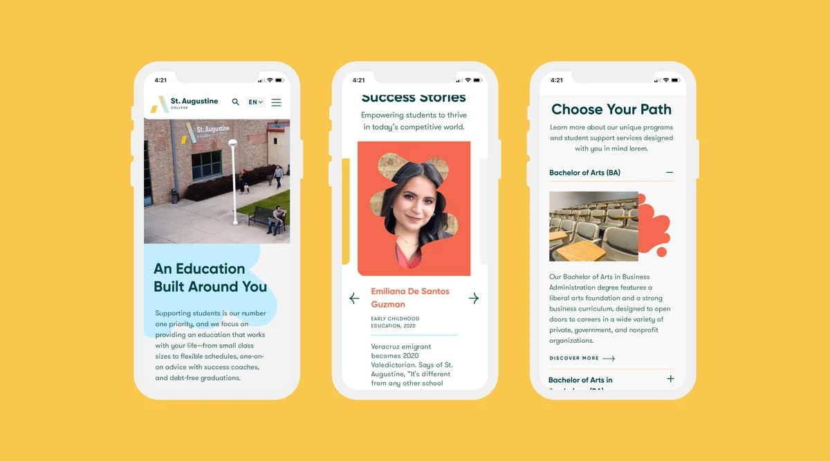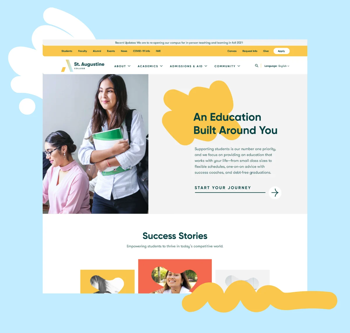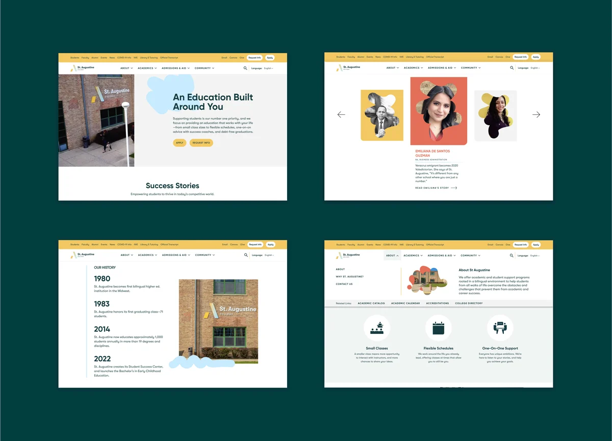 St. Augustine College is a Hispanic Serving Institution founded in 1980 to help Hispanic and other underrepresented individuals succeed in today’s competitive world. We developed their new brand identity to feel bold, modern, and inviting—and steeped in academic excellence—allowing the college to expand into the digital space,while showcasing a unique dedication to the success of current, past, and prospective students.